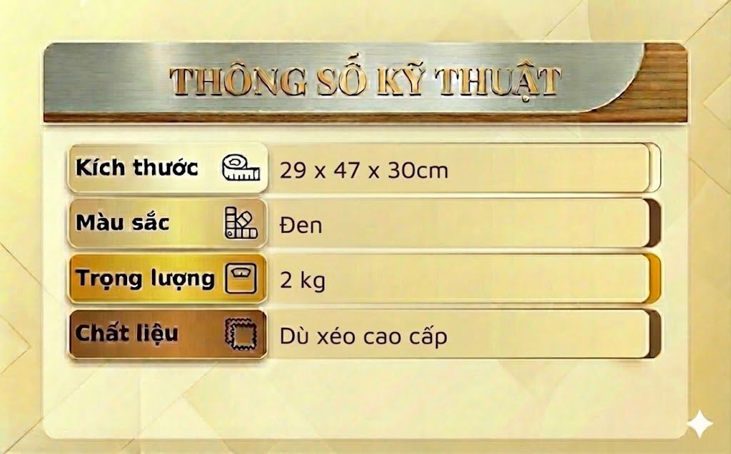 Sản phẩm có kích thước 29 x 47 x 30cm, được trang bị nhiều ngăn khác nhau. Ngăn chính rộng rãi để đựng quần áo, thiết bị công nghệ cần thiết còn các ngăn phụ tiện lợi cho phép bạn đựng các vật dụng cá nhân gọn nhỏ. Bạn dễ dàng sắp xếp và tìm kiếm khi cần.