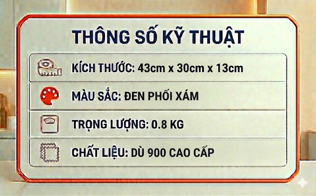Sản phẩm có kích thước chuẩn 43 x 30 x 13cm, có thể đựng các loại laptop lên đến 14 inch. Balo được trang bị nhiều ngăn chính và ngăn phụ tiện lợi, cho phép người dùng đựng thêm nhiều đồ đạc khác và phân loại chúng một cách gọn gàng, giúp dễ tìm kiếm khi cần.